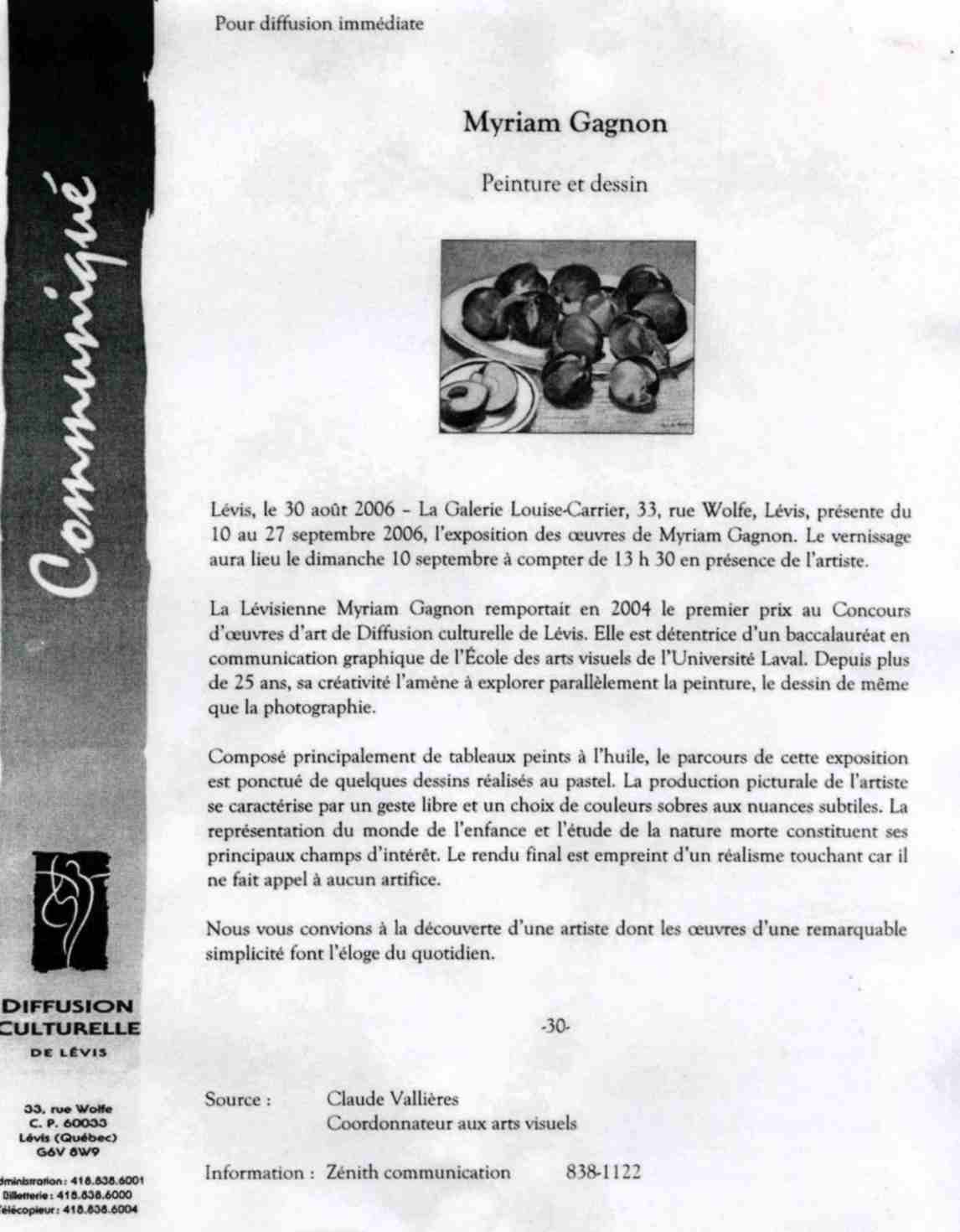 EXPOSITION SOLO à la Galerie Louise-Carrier de Lévis, du 10 au 27 septembre 2006 (voir le carton d'invitation et lecommuniqué de presse ).