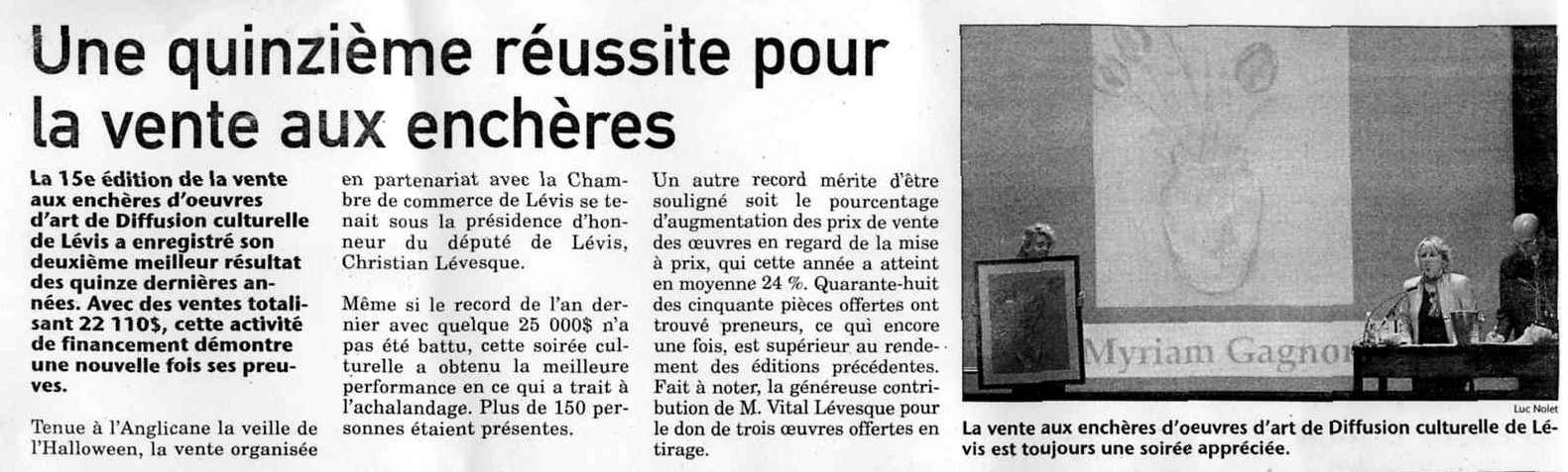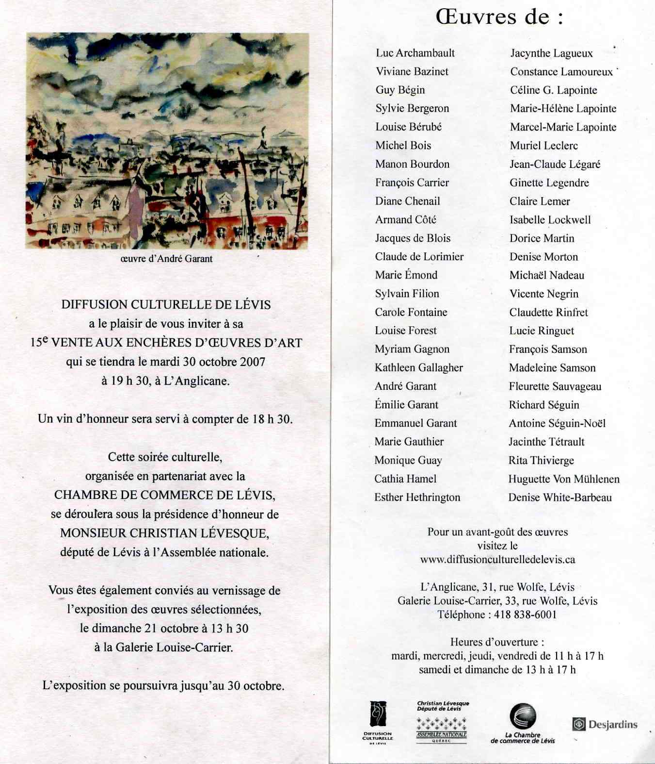 12ième, 14ième, 15ième Vente aux enchères d'Oeuvres d'Art, 16ième, 17ième, 18ième, 19ième et 20ième du programme Diffusion Culturelle de Lévis , à la