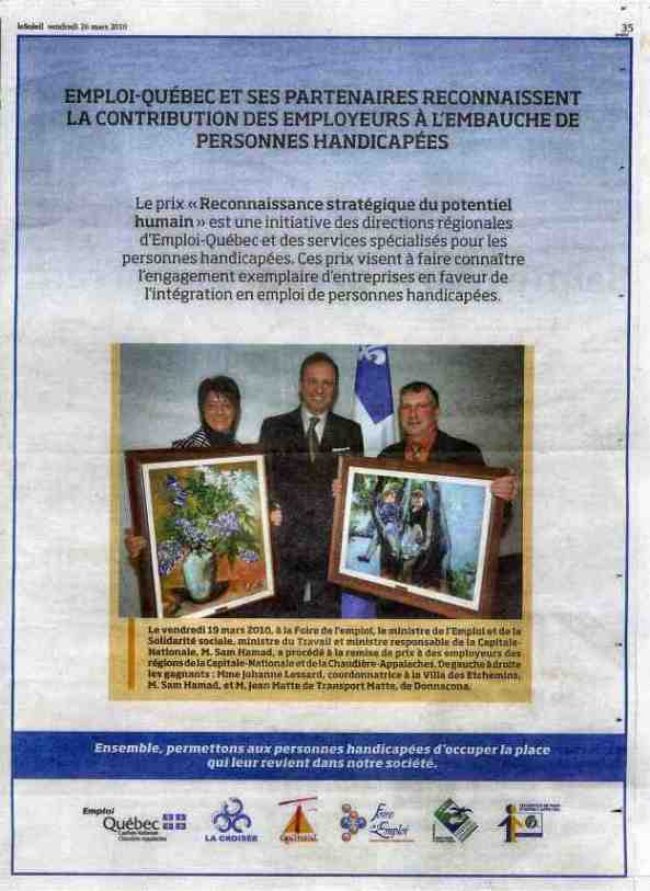 Un choix de mes toiles offertes par Emploi-Québec comme prix de Reconnaissance stratégique du potentiel humain 2010 .